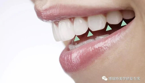 两中切牙间接触点最低,越靠后的牙齿邻接点越高,邻接点连线与下唇弧度协调。