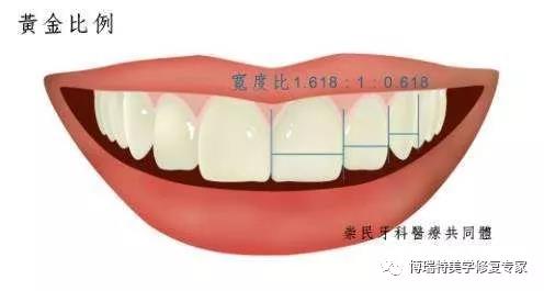 黄金比例的牙齿正面的视觉比例,牙与牙之间关系位置为1.618:1:0.618,让人看起來很舒服和谐。两上中切牙宽度是高度的80%,一般中切牙和尖牙长度相同,单颗牙长宽比约为 0.8~0.85最佳。