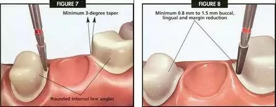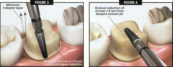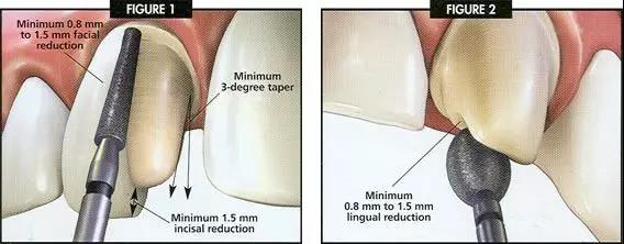 对于后牙区的修毛毛虫体必须为饰面瓷预留出最小1.0mm的咬颌面瓷层厚度。基底冠的厚度最少为0.4mm,因此咬颌面应该磨除1.5mm。相对的轴面聚合角度应6-8°,轴壁与咬颌面的连接处应圆钝。