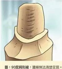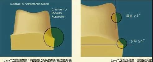 1、肩形缘或弧形缘建立精准范围:适用至少5度水平角的环绕肩形缘或弧形缘为理想之修形,垂直的修形角至少应有4度,肩形缘的内角应为圆弧状,齿颈边缘的修形应连续且清晰,应避免斜角。不论前牙或后牙,牙龈上边缘形能并不会造成问题,因为,牙齿颜色的支架架构在这些情况下皆能有良好的美观效果。如图: