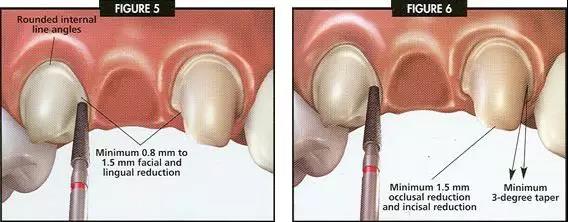 前牙修复体的预备主要是根据如前所述的基本预备原则。周缘的预备宽度为1.0mm,同时轴壁必须圆钝,就像唇面一样(最小半径:0.4mm)