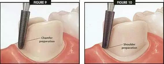 宜:圆缓的斜面肩,或轴-颈线角圆钝的水平直角肩台 。应预备成以下形态:1、明显的斜面(90度)2、将肩台预备成圆钝的轴-颈线角具有圆形尖端的圆柱形金刚砂车针很适合用于预备斜面,而具有圆形边缘的锥形金刚砂车针适合将肩台预备成圆钝的铀-颈线角。