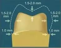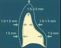 从美观的角度出发,切缘的去除量应达到2.0mm,前庭 -- 口腔方向的最小切缘宽度应为0.9mm,以确保切削装置能够精确的复制出基底冠的内侧组织面。