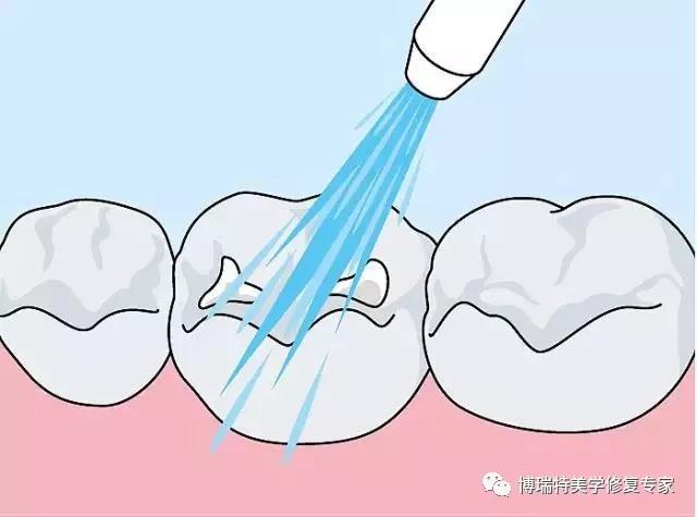 注意防止三用枪有油和水污染,可在干燥前先试一下三用枪,确保气枪仅有压缩空气时再进行吹干牙面,防止水油气混合影响干燥效果;当干燥上磨牙窝沟时,控制气枪,使气流不要太大,以免溅起唾液污染牙面;干燥过程中如果唾液分泌太多,可以同时配合吸唾器的使用。
