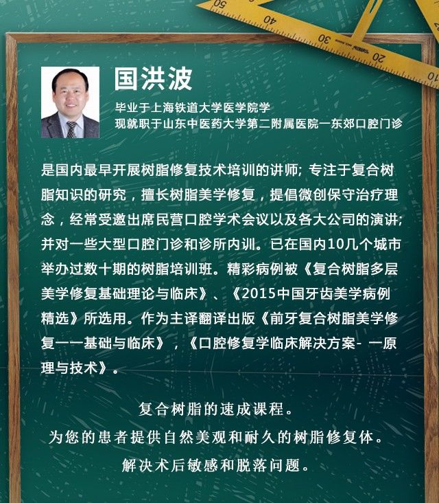 本次课程为三天;两天理论课(一天后牙理论,一天前牙理论);一天操作课。凡参加操作课的学员请自带光固化灯一台,主办方提供2颗后牙1颗前牙进行操作。