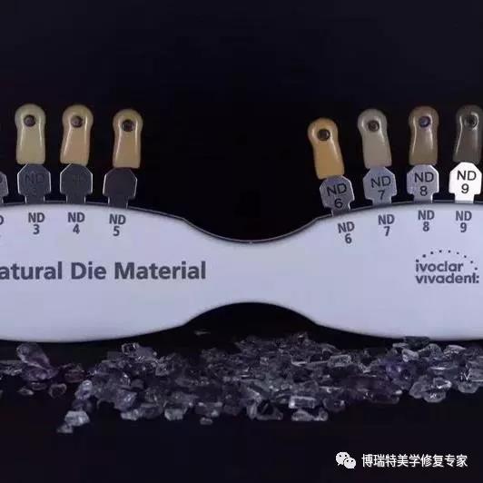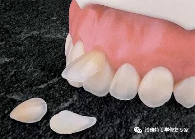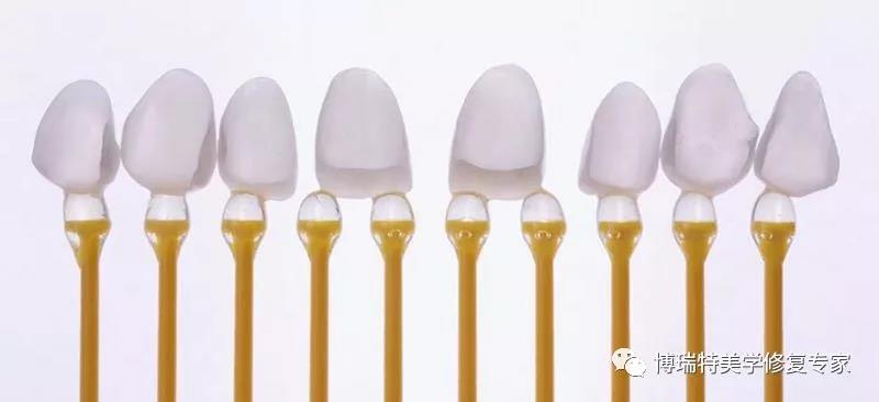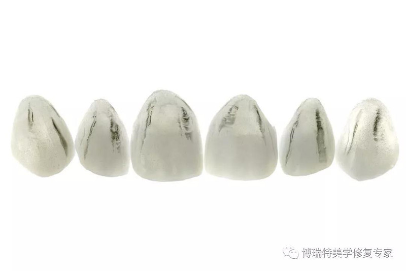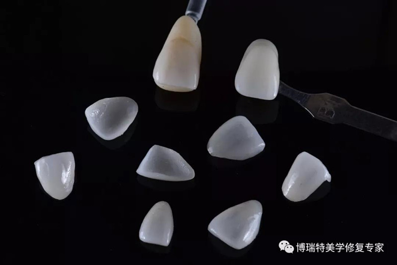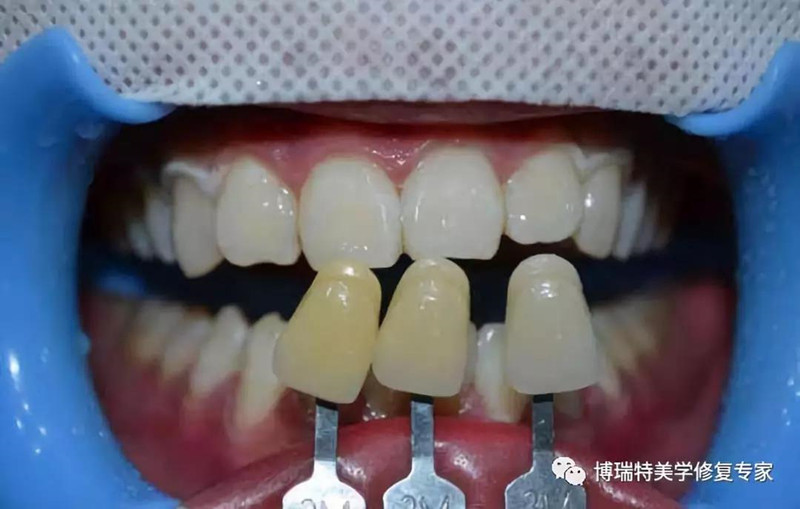 为了使瓷贴面修复体达到理想的颜色效果,基牙的比色尤为重要。技师根据比色板的显示,制作相应的代型模型来模拟患者基牙的颜色,光泽和亮度。将完成的修复体放置于该代型材料上进行染色,使完成的全瓷材料能够更好地表达在口腔中自然光线下的效果。技师通过牙科医生提供的天然牙比色和基牙比色结果,选择相对应的全瓷材料,避免因基牙的颜色而影响最终的瓷贴面修复体的美学效果。