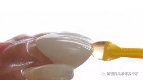 临床一般使用可保证充足的临床操作时间,颜色稳定性好的光固化树脂水门汀进行瓷贴面粘结。双固化树脂水门汀尽管结合了光固化和化学固化水门汀的优点,可以在光照射不到的深部进一步化学固化,具有更好的机械性能,但双固化树脂的配方中含有芳香三元胺,影响长期颜色稳定性。