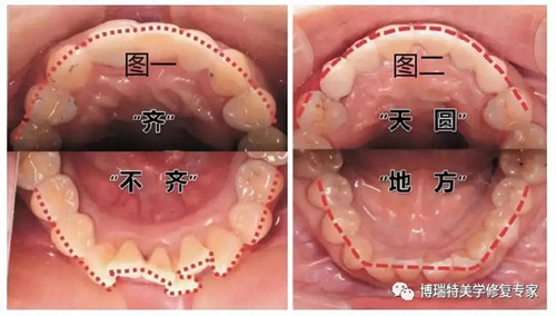 患者希望前牙修复后整齐对称,而其自然牙列的排列却可能并不齐整。例如图1所示病例,11~22已行全瓷联冠修复,而42~32牙列拥挤不齐,在下颌前导功能运动过程中“不齐”的下前牙与“齐”的上前牙腭侧发生咬合接触的时间、程度和顺序必然不同。此外,同一患者上下颌牙弓曲线有的也存在显著差异,需要在DFD过程中特别留意。例如图2显示病例,上颌牙弓曲线为圆弧形而下颌为方形, 这种状态下前导功能过程中前牙区上下牙弓整体的咬合区域和接触程度也会与常人不同。
