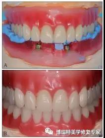 最终修复:种植体完成骨整合后,制作个性化印模托盘,使用聚硫(polysulfide)橡胶或聚醚(polyether)橡胶同时制取种植体及下颌无牙颌终印模,再次于口内试戴人工牙。完成杆卡及义齿的制作,于口内试戴杆卡,X线片检查杆卡与种植体肩台的密合性,试戴义齿。
