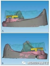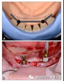 图3 种植位点及手术。A:根据人工牙与牙槽嵴顶水平关系设计杆卡及种植位点,使杆位于牙槽嵴顶与人工牙之间;B:按照设计位点植入2枚种植体。