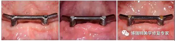 图8 杆卡口内照 A:杆卡初就位;B:8个月复诊;C:18个月复诊