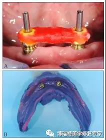 图4 终印模制取 A:模型树脂连接印模转移杆;B:下颌终印模