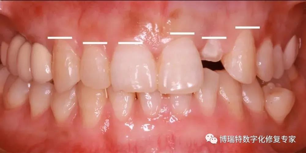 8226; 薄龈生物型,角化龈宽度充足,龈缘高度不协调;