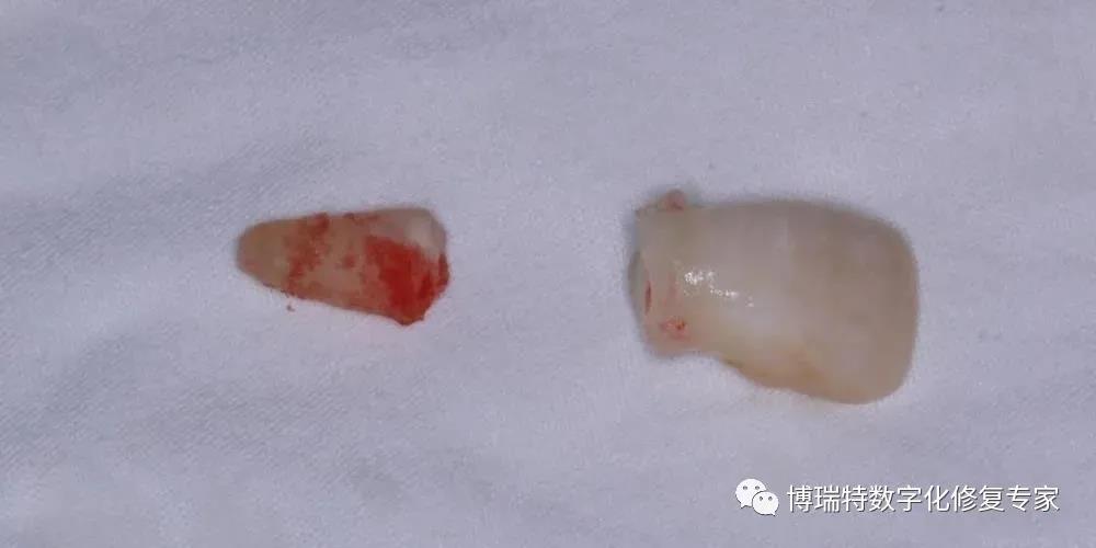 8226; 局麻下,微创拔除21患牙,图见 21 牙冠与牙根完全分离;