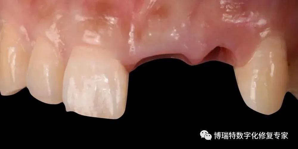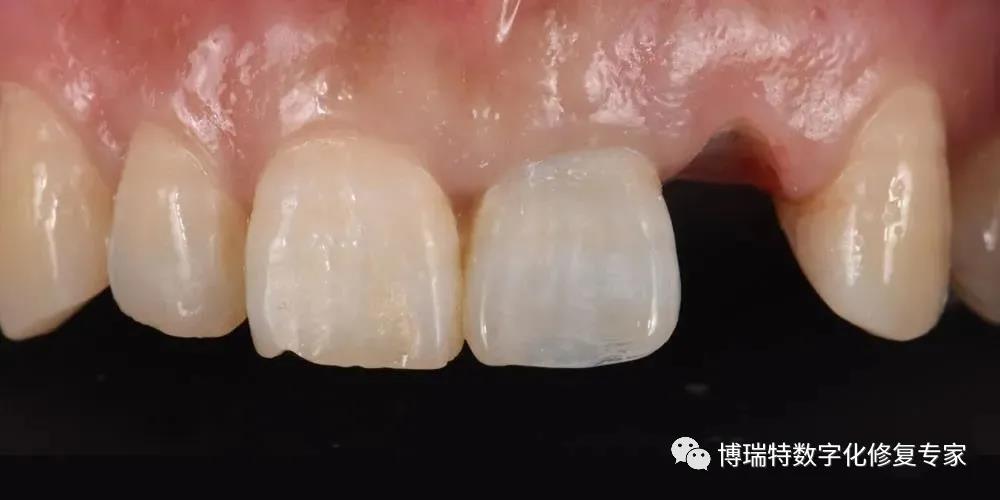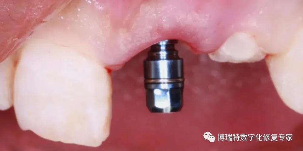 本病例中,患者为薄龈生物型,增加了种植体唇侧龈缘退缩的风险,术前已告知患者若后期软组织轮廓凹陷,龈缘高度不协调,要进行软组织增量术,改善牙龈的美观效果。在患者术后七个月进行最终修复时,前牙区牙龈高度协调,附着龈宽度适中,唇侧轮廓丰满度较好,美学效果理想。