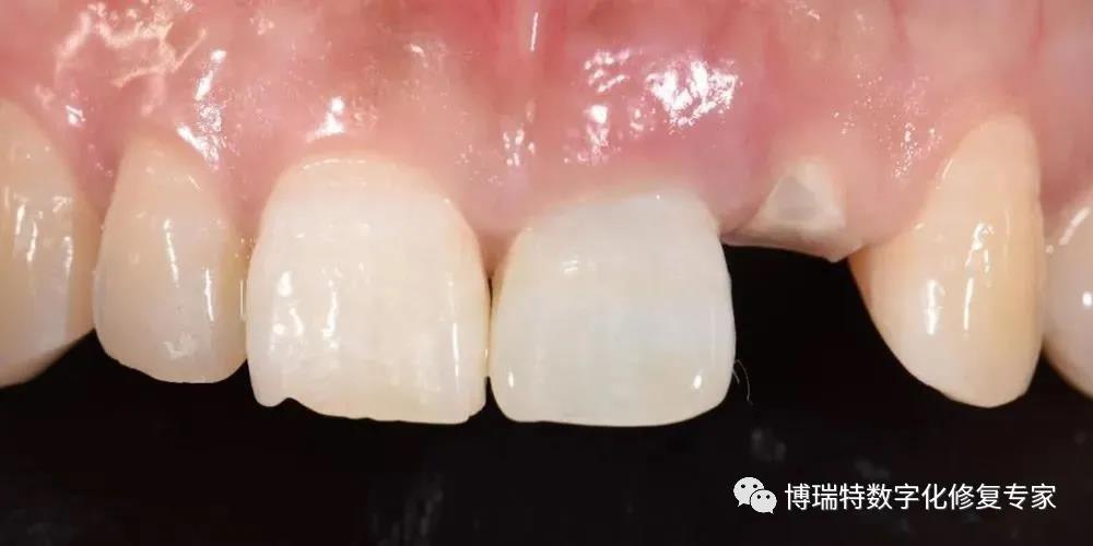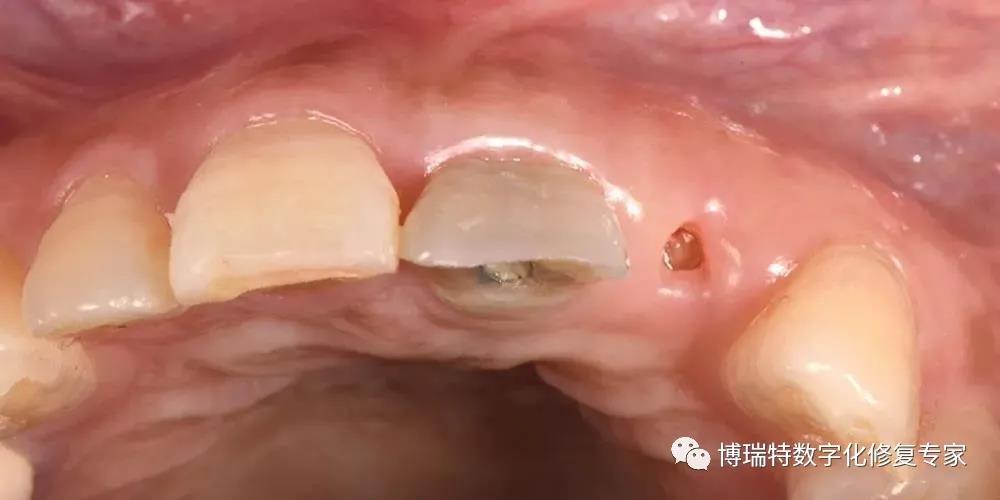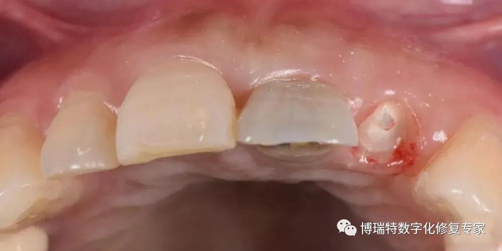 8226; 四个月后,取下临时修复体,见21牙龈高度与11基本一致,穿龈轮廓初步成形,22牙龈基本覆盖断根面;