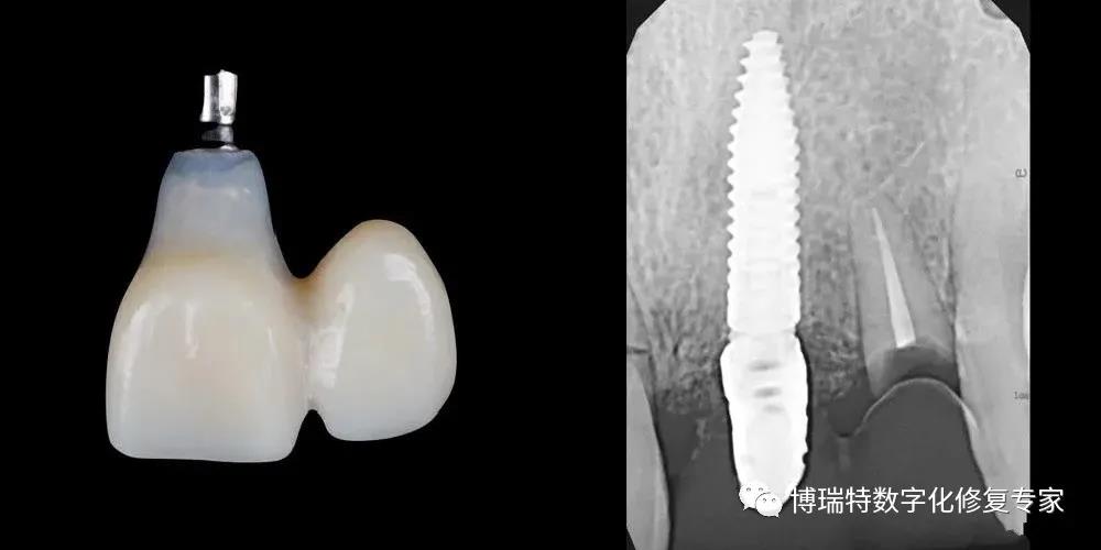 22根长较短,且位于龈下,若经正畸牵引后行桩核冠修复,修复体冠根比过大,愈后较差。在美学区为了获得更好的美学效果,尽量避免连续植入种植体,因此选择在21位点即刻植入机械强度更高的Roxolid®种植体,后期行种植体支持式的单端桥修复;