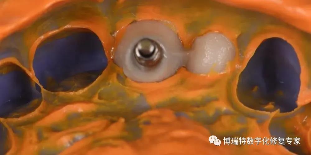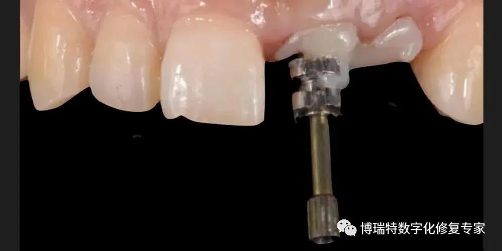 8226; 利用患者21天然牙冠制作种植体支持式螺丝固位临时修复体,21螺丝孔从腭侧穿出;