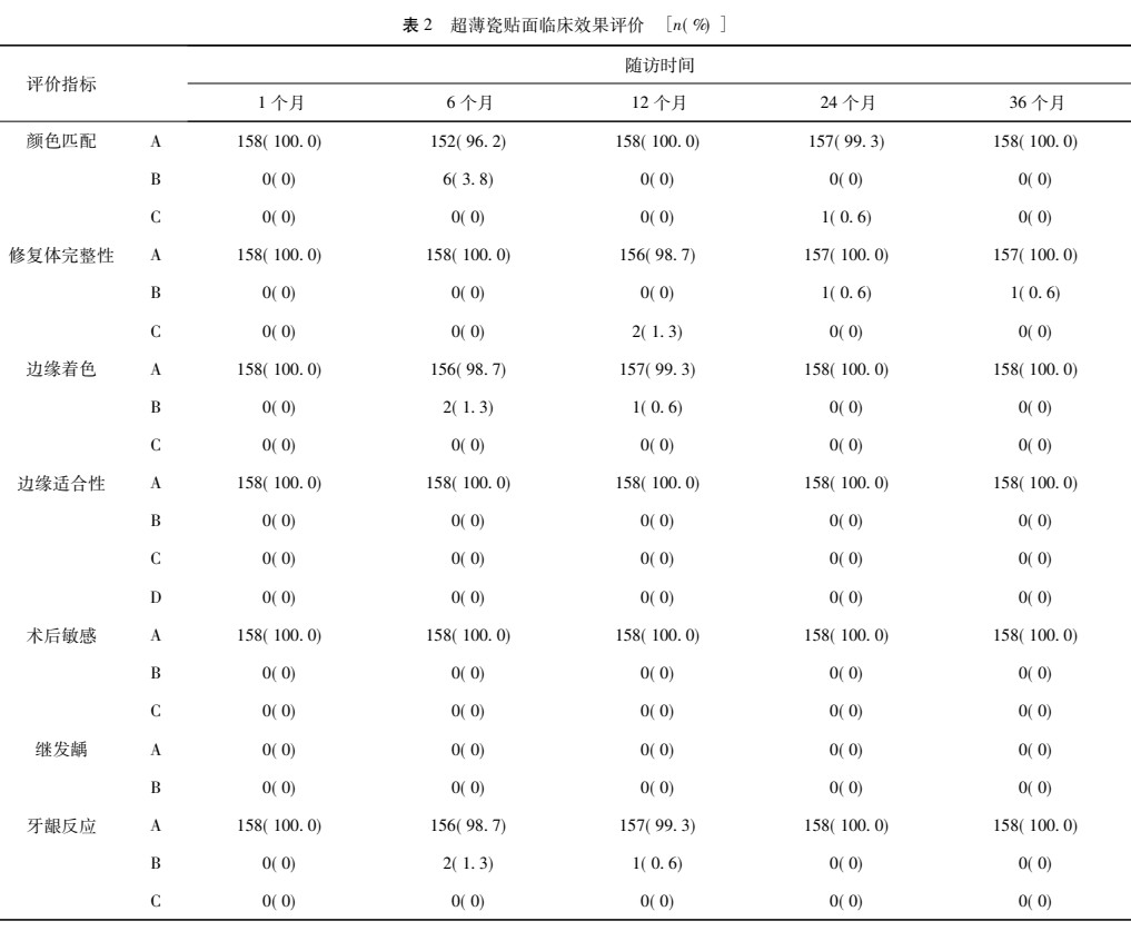 24个月复诊,1颗(0.6%)颜色匹配为C级;1颗(0.6%)修复体完整性为B级。